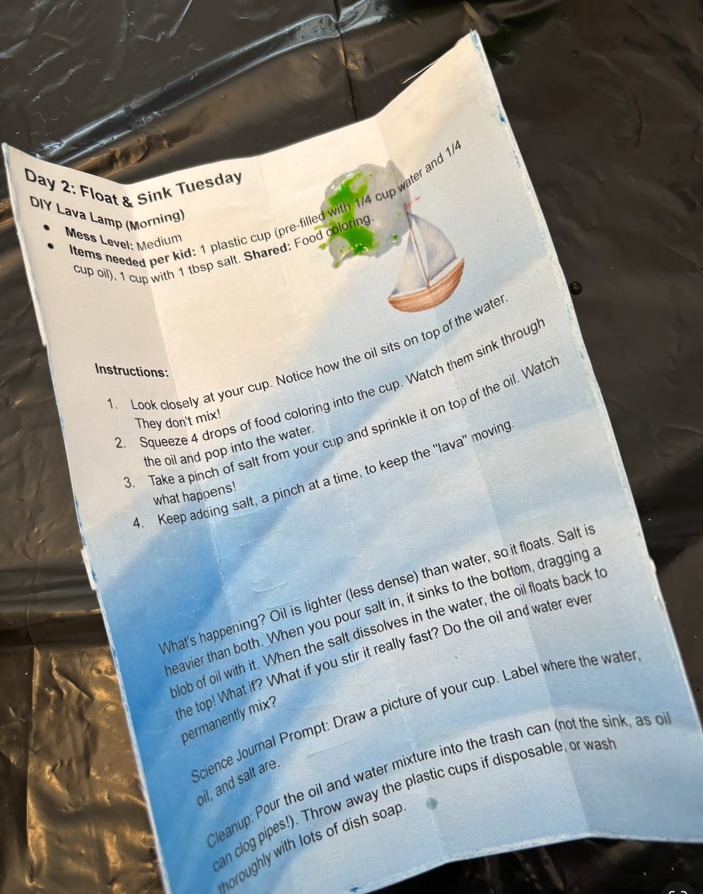 Tuesday was a float and sink experiment with oil and water. The activity itself was straightforward, but something interesting happened when the kids read through AI’s instructions.